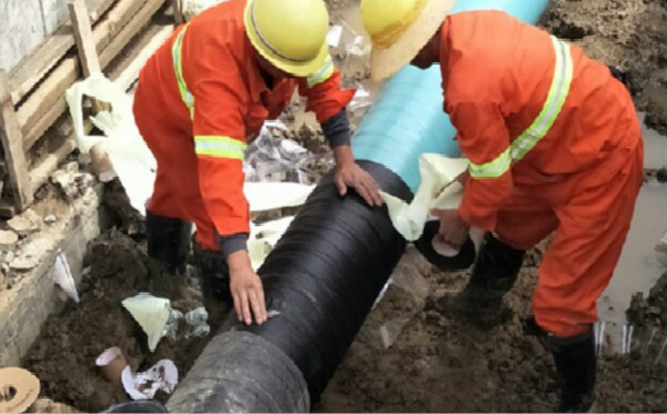 2、對焊縫兩側(cè)或有缺陷的部位選用粘彈體防腐膏填充凹凸,達到平整光滑。對原防腐層與新作工藝相接處,采取修坡倒角,角度不小于20°的處理。