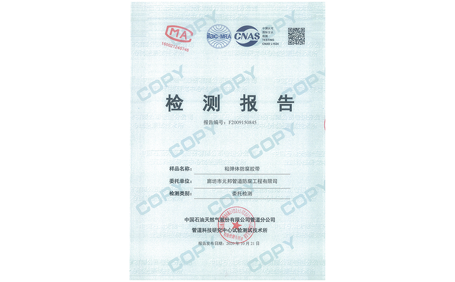 ? ? ? ? 全民塑膠生產(chǎn)的粘彈體膠帶,由廊坊市元邦管道防腐工程有限公司現(xiàn)場抽樣送檢,由國家認(rèn)可實驗室依據(jù)CDP-S-OGP-AC-017-2013-2油氣管道工程粘彈體防腐材料技術(shù)規(guī)格書,對檢測項目、技術(shù)指標(biāo)和試驗方法要求完全符合。